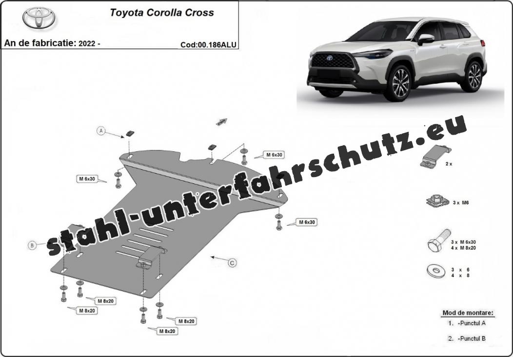 Die Abschirmung schützt: Katalysator Toyota Corolla Cross - 2022 und 2025. Der Unterfahrschutz ist neu und passt perfekt für alle Toyota Corolla Cross versionen, die zwischen 2022 und 2025 hergestellt wurden. Aus Aluminiumblech angefertigt mit einer Stärke von 3 mm. Die Schilde bestehen aus Aluminium, aber die Befestigungshalterungen bestehen aus Stahl. Schrauben, Mutter, Klips - alle Befestigungszubehör sind im Lieferung enthalten. Um mehr Schutz zu bieten gegen Korrosion wird der Unterfahrschutz elektrostatisch besprüht (Pulverbeschichtet) und bei 200o eingebrannt bzw. getrocknet. |