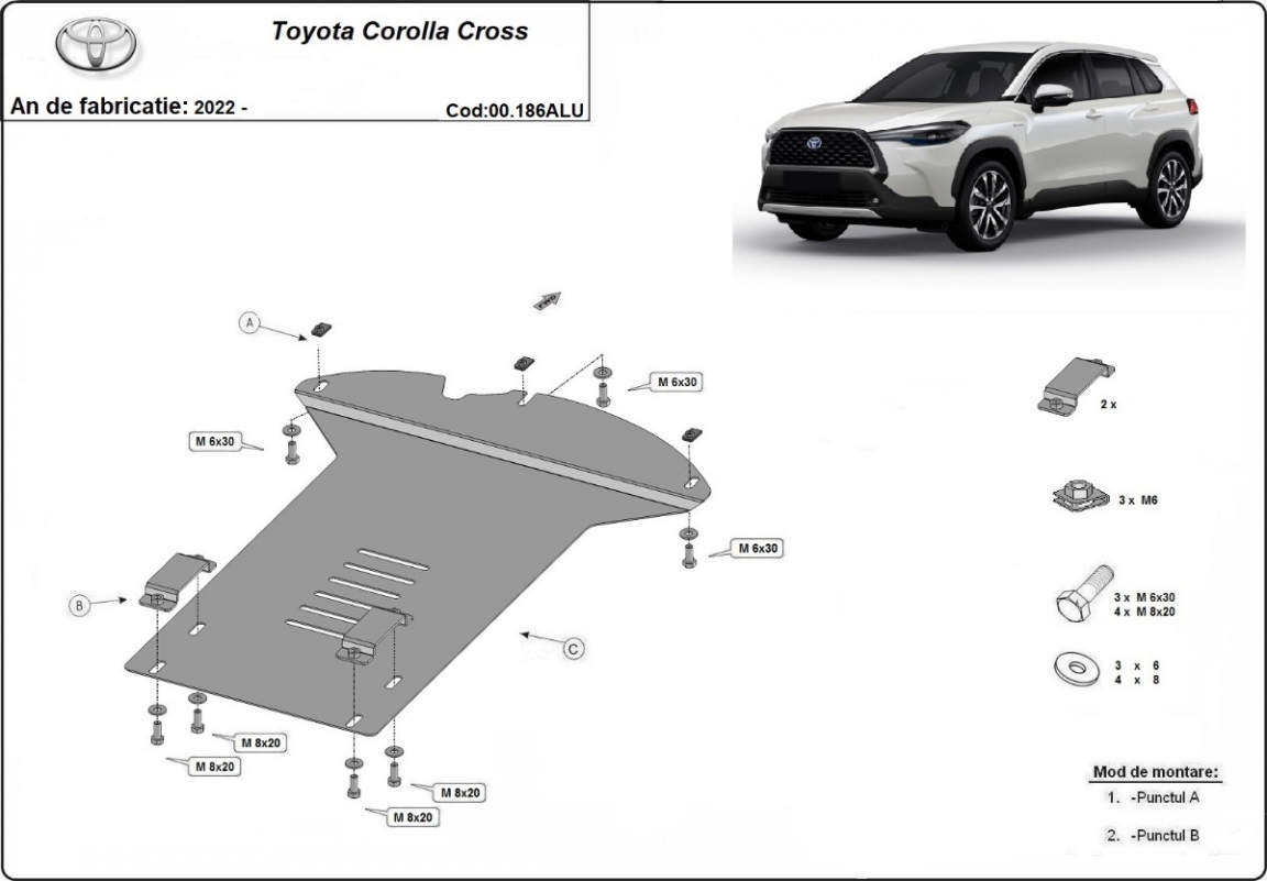 Die Abschirmung schützt: Katalysator Toyota Corolla Cross - 2022 und 2026. Der Unterfahrschutz ist neu und passt perfekt für alle Toyota Corolla Cross versionen, die zwischen 2022 und 2026 hergestellt wurden. Aus Aluminiumblech angefertigt mit einer Stärke von 3 mm. Die Schilde bestehen aus Aluminium, aber die Befestigungshalterungen bestehen aus Stahl. Schrauben, Mutter, Klips - alle Befestigungszubehör sind im Lieferung enthalten. Um mehr Schutz zu bieten gegen Korrosion wird der Unterfahrschutz elektrostatisch besprüht (Pulverbeschichtet) und bei 200o eingebrannt bzw. getrocknet. |