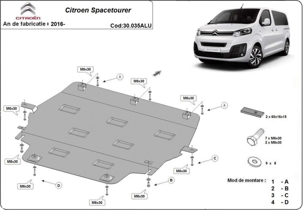 Die Abschirmung schützt: motor, getriebe, kühler Citroen Spacetourer - 2016 und 2026. Der Unterfahrschutz ist neu und passt perfekt für alle Citroen Spacetourer versionen, die zwischen 2016 und 2026 hergestellt wurden. Aus Aluminiumblech angefertigt mit einer Stärke von 3 mm. Die Schilde bestehen aus Aluminium, aber die Befestigungshalterungen bestehen aus Stahl. Schrauben, Mutter, Klips - alle Befestigungszubehör sind im Lieferung enthalten. Um mehr Schutz zu bieten gegen Korrosion wird der Unterfahrschutz elektrostatisch besprüht (Pulverbeschichtet) und bei 200o eingebrannt bzw. getrocknet. |