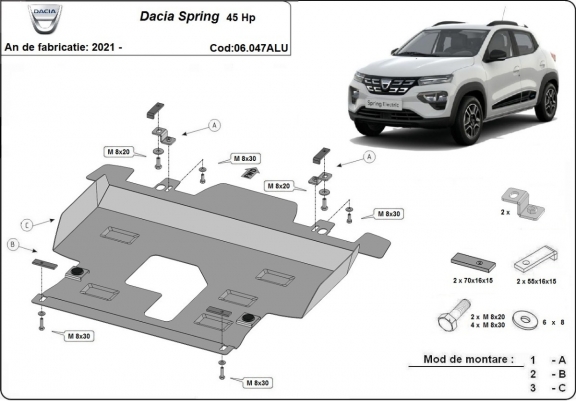 Die Abschirmung schützt: motor, getriebe, kühler Dacia Spring - 2021 und 2026. Der Unterfahrschutz ist neu und passt perfekt für alle Dacia Spring versionen, die zwischen 2021 und 2026 hergestellt wurden. Aus Aluminiumblech angefertigt mit einer Stärke von 4 mm. Die Schilde bestehen aus Aluminium, aber die Befestigungshalterungen bestehen aus Stahl. Schrauben, Mutter, Klips - alle Befestigungszubehör sind im Lieferung enthalten. Um mehr Schutz zu bieten gegen Korrosion wird der Unterfahrschutz elektrostatisch besprüht (Pulverbeschichtet) und bei 200o eingebrannt bzw. getrocknet. |