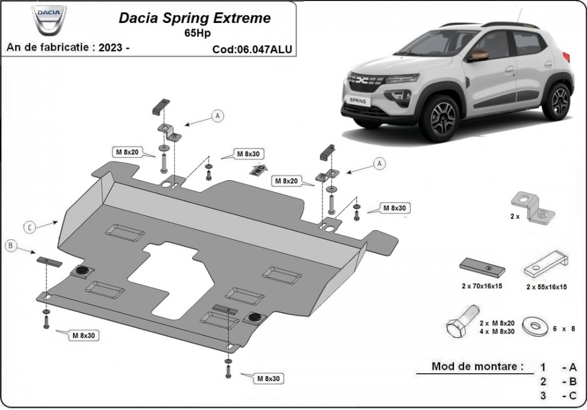 Die Abschirmung schützt: motor, getriebe, kühler Dacia Spring - 2023 und 2026. Der Unterfahrschutz ist neu und passt perfekt für alle Dacia Spring versionen, die zwischen 2023 und 2026 hergestellt wurden. Aus Aluminiumblech angefertigt mit einer Stärke von 4 mm. Die Schilde bestehen aus Aluminium, aber die Befestigungshalterungen bestehen aus Stahl. Schrauben, Mutter, Klips - alle Befestigungszubehör sind im Lieferung enthalten. Um mehr Schutz zu bieten gegen Korrosion wird der Unterfahrschutz elektrostatisch besprüht (Pulverbeschichtet) und bei 200o eingebrannt bzw. getrocknet. |