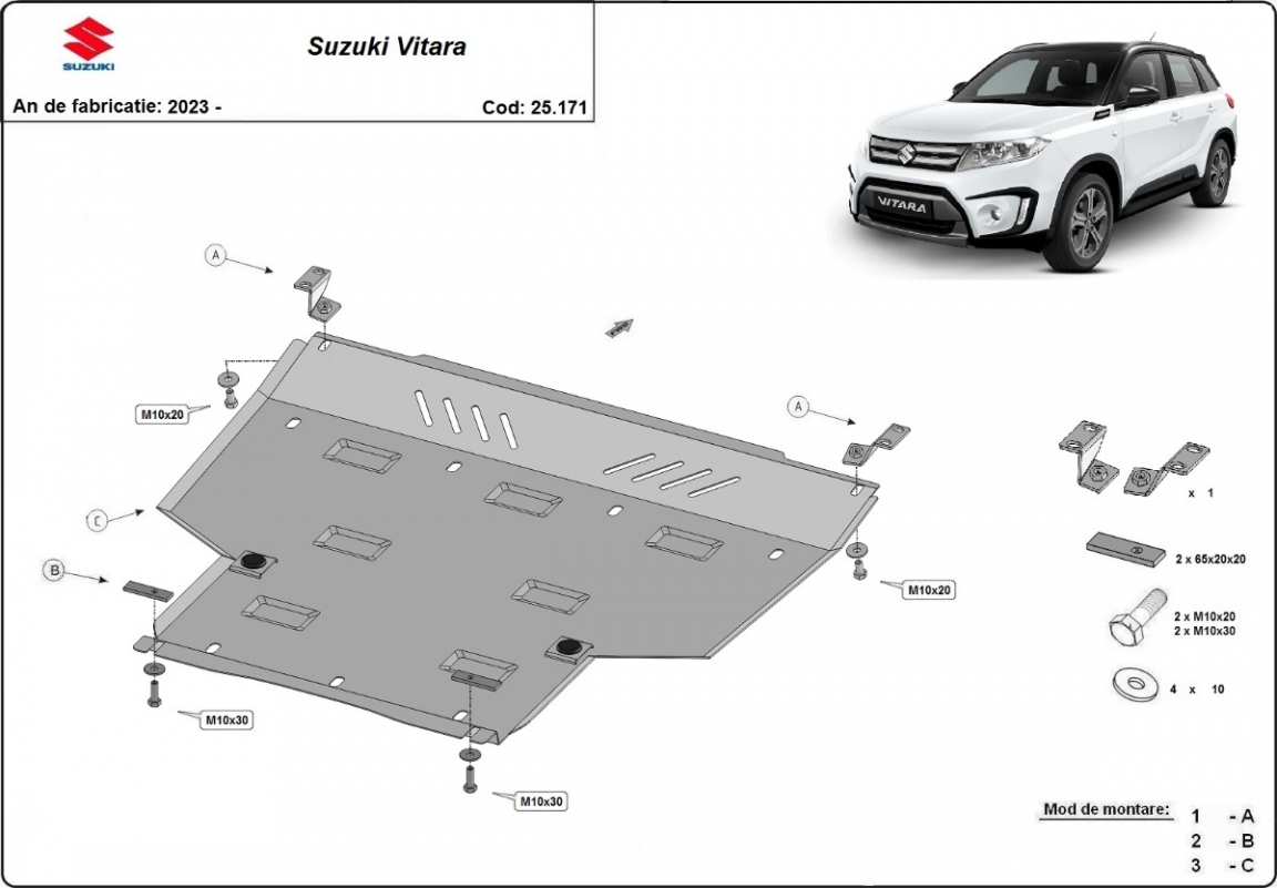 Die Abschirmung schützt: motor, getriebe, kühler Suzuki Vitara - 2023 und 2026. Der Unterfahrschutz ist neu und passt perfekt für alle Suzuki Vitara versionen, die zwischen 2023 und 2026 hergestellt wurden. Aus Aluminiumblech angefertigt mit einer Stärke von 3 mm. Die Schilde bestehen aus Aluminium, aber die Befestigungshalterungen bestehen aus Stahl. Schrauben, Mutter, Klips - alle Befestigungszubehör sind im Lieferung enthalten. Um mehr Schutz zu bieten gegen Korrosion wird der Unterfahrschutz elektrostatisch besprüht (Pulverbeschichtet) und bei 200o eingebrannt bzw. getrocknet. |
