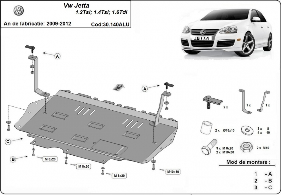 Die Abschirmung schützt: motor, getriebe, kühler VW Jetta - 2009 und 2012. Der Unterfahrschutz ist neu und passt perfekt für den VW Jetta mit den folgenden Motor- / Antriebsversionen: 1.2Tsi, 1.4Tsi, 1.6Tdi - hergestellt zwischen 2009 und 2012. Aus Aluminiumblech angefertigt mit einer Stärke von 3 mm. Die Schilde bestehen aus Aluminium, aber die Befestigungshalterungen bestehen aus Stahl. Schrauben, Mutter, Klips - alle Befestigungszubehör sind im Lieferung enthalten. Um mehr Schutz zu bieten gegen Korrosion wird der Unterfahrschutz elektrostatisch besprüht (Pulverbeschichtet) und bei 200o eingebrannt bzw. getrocknet. |