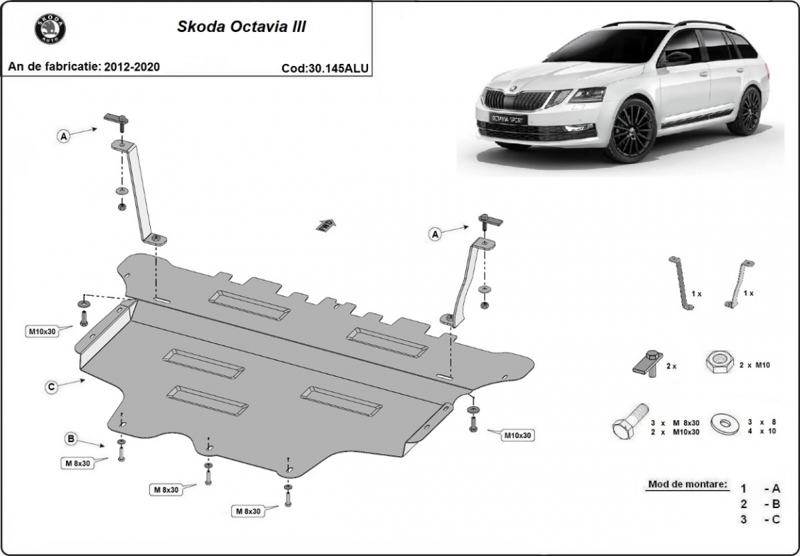 Die Abschirmung schützt: motor, getriebe, kühler, vordere stossfänger Skoda Octavia 3 - 2012 und 2020. Der Unterfahrschutz ist neu und passt perfekt für alle Skoda Octavia 3 versionen, die zwischen 2012 und 2020 hergestellt wurden. Aus Aluminiumblech angefertigt mit einer Stärke von 3 mm. Die Schilde bestehen aus Aluminium, aber die Befestigungshalterungen bestehen aus Stahl. Schrauben, Mutter, Klips - alle Befestigungszubehör sind im Lieferung enthalten. Um mehr Schutz zu bieten gegen Korrosion wird der Unterfahrschutz elektrostatisch besprüht (Pulverbeschichtet) und bei 200o eingebrannt bzw. getrocknet. |