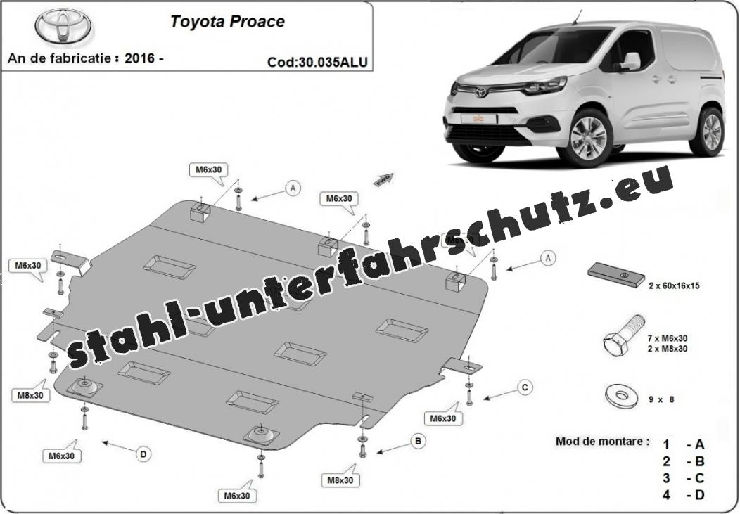 Die Abschirmung schützt: motor, getriebe, kühler Toyota Proace - 2016 und 2026. Der Unterfahrschutz ist neu und passt perfekt für alle Toyota Proace versionen, die zwischen 2016 und 2026 hergestellt wurden. Aus Aluminiumblech angefertigt mit einer Stärke von 3 mm. Die Schilde bestehen aus Aluminium, aber die Befestigungshalterungen bestehen aus Stahl. Schrauben, Mutter, Klips - alle Befestigungszubehör sind im Lieferung enthalten. Um mehr Schutz zu bieten gegen Korrosion wird der Unterfahrschutz elektrostatisch besprüht (Pulverbeschichtet) und bei 200o eingebrannt bzw. getrocknet. |
