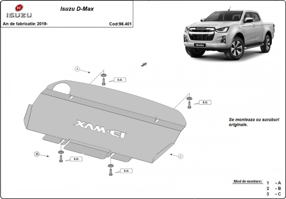 Die Abschirmung schützt: kühler Isuzu D-Max - 2019 und 2026. Der Unterfahrschutz ist neu und passt perfekt für alle Isuzu D-Max versionen, die zwischen 2019 und 2026 hergestellt wurden. Aus Stahlblech angefertigt mit einer Stärke von 3 mm. Schrauben, Mutter, Klips - alle Befestigungszubehör sind im Lieferung enthalten. Um mehr Schutz zu bieten gegen Korrosion wird der Unterfahrschutz elektrostatisch besprüht (Pulverbeschichtet) und bei 200o eingebrannt bzw. getrocknet. |