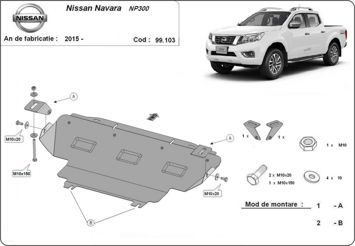 Die Abschirmung schützt: kühler Nissan Navara NP300 - 2015 und 2021. Der Unterfahrschutz ist neu und passt perfekt für alle Nissan Navara NP300 versionen, die zwischen 2015 und 2021 hergestellt wurden. Aus Stahlblech angefertigt mit einer Stärke von 2 mm. Schrauben, Mutter, Klips - alle Befestigungszubehör sind im Lieferung enthalten. Um mehr Schutz zu bieten gegen Korrosion wird der Unterfahrschutz elektrostatisch besprüht (Pulverbeschichtet) und bei 200o eingebrannt bzw. getrocknet. |