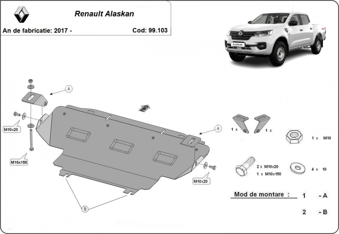 Die Abschirmung schützt: kühler Renault Alaskan - 2017 und 2026. Der Unterfahrschutz ist neu und passt perfekt für alle Renault Alaskan versionen, die zwischen 2017 und 2026 hergestellt wurden. Aus Stahlblech angefertigt mit einer Stärke von 2 mm. Schrauben, Mutter, Klips - alle Befestigungszubehör sind im Lieferung enthalten. Um mehr Schutz zu bieten gegen Korrosion wird der Unterfahrschutz elektrostatisch besprüht (Pulverbeschichtet) und bei 200o eingebrannt bzw. getrocknet. |