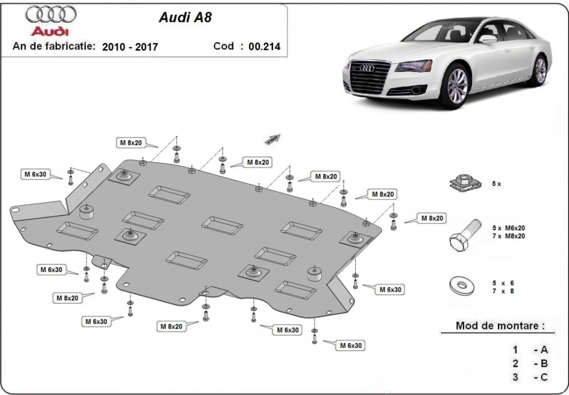 Die Abschirmung schützt: getriebe Audi A8 - 2010 und 2017. Der Unterfahrschutz ist neu und passt perfekt für alle Audi A8 versionen, die zwischen 2010 und 2017 hergestellt wurden. Aus Stahlblech angefertigt mit einer Stärke von 2 mm. Schrauben, Mutter, Klips - alle Befestigungszubehör sind im Lieferung enthalten. Um mehr Schutz zu bieten gegen Korrosion wird der Unterfahrschutz elektrostatisch besprüht (Pulverbeschichtet) und bei 200o eingebrannt bzw. getrocknet. |