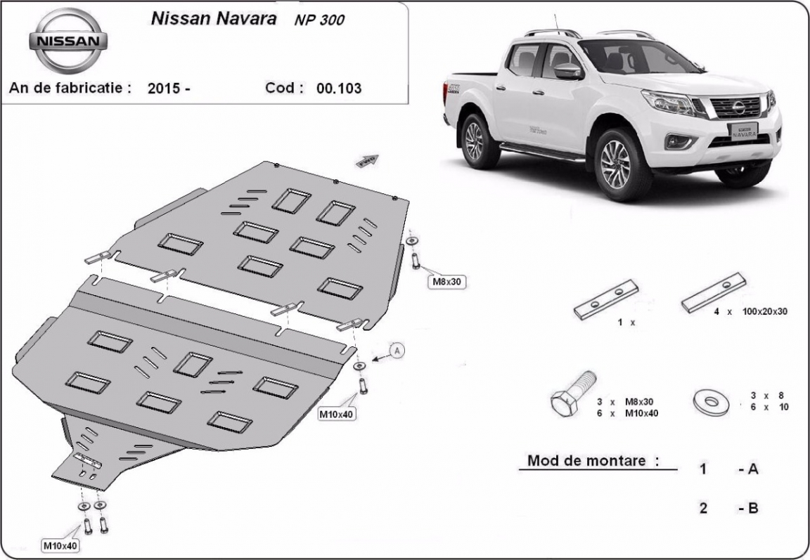 Die Abschirmung schützt: getriebe, Verteilergetriebe Nissan Navara NP300 - 2015 und 2021. Der Unterfahrschutz ist neu und passt perfekt für alle Nissan Navara NP300 versionen, die zwischen 2015 und 2021 hergestellt wurden. Aus Stahlblech angefertigt mit einer Stärke von 3 mm. Schrauben, Mutter, Klips - alle Befestigungszubehör sind im Lieferung enthalten. Um mehr Schutz zu bieten gegen Korrosion wird der Unterfahrschutz elektrostatisch besprüht (Pulverbeschichtet) und bei 200o eingebrannt bzw. getrocknet. |