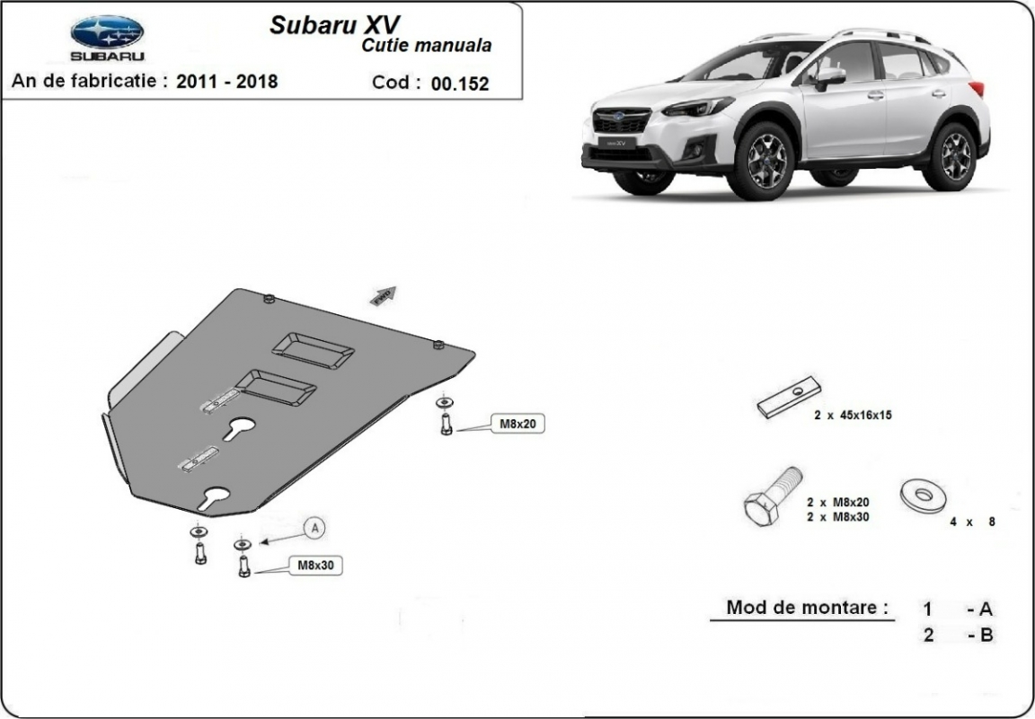 Die Abschirmung schützt: getriebe Subaru XV - 2011 und 2017. Der Unterfahrschutz ist neu und passt perfekt für alle Subaru XV versionen, die zwischen 2011 und 2017 hergestellt wurden. Aus Stahlblech angefertigt mit einer Stärke von 2 mm. Schrauben, Mutter, Klips - alle Befestigungszubehör sind im Lieferung enthalten. Um mehr Schutz zu bieten gegen Korrosion wird der Unterfahrschutz elektrostatisch besprüht (Pulverbeschichtet) und bei 200o eingebrannt bzw. getrocknet. |
