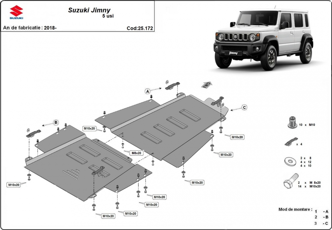 Die Abschirmung schützt: getriebe, Verteilergetriebe Suzuki Jimny - 2018 und 2026. Der Unterfahrschutz ist neu und passt perfekt für alle Suzuki Jimny versionen, die zwischen 2018 und 2026 hergestellt wurden. Aus Stahlblech angefertigt mit einer Stärke von 2.5 mm. Schrauben, Mutter, Klips - alle Befestigungszubehör sind im Lieferung enthalten. Um mehr Schutz zu bieten gegen Korrosion wird der Unterfahrschutz elektrostatisch besprüht (Pulverbeschichtet) und bei 200o eingebrannt bzw. getrocknet. |