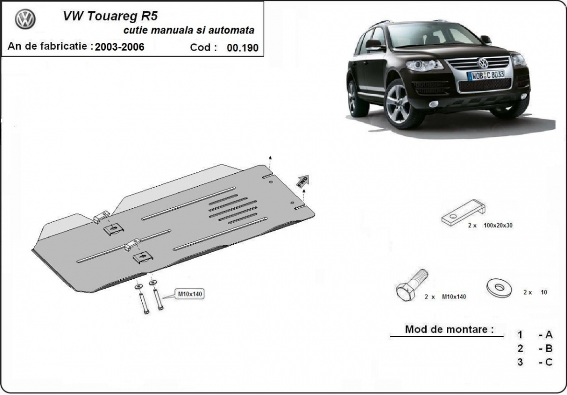 Die Abschirmung schützt: getriebe VW Touareg 7L - 2003 und 2006. Der Unterfahrschutz ist neu und passt perfekt für alle VW Touareg 7L versionen, die zwischen 2003 und 2006 hergestellt wurden. Aus Stahlblech angefertigt mit einer Stärke von 3 mm. Schrauben, Mutter, Klips - alle Befestigungszubehör sind im Lieferung enthalten. Um mehr Schutz zu bieten gegen Korrosion wird der Unterfahrschutz elektrostatisch besprüht (Pulverbeschichtet) und bei 200o eingebrannt bzw. getrocknet. |