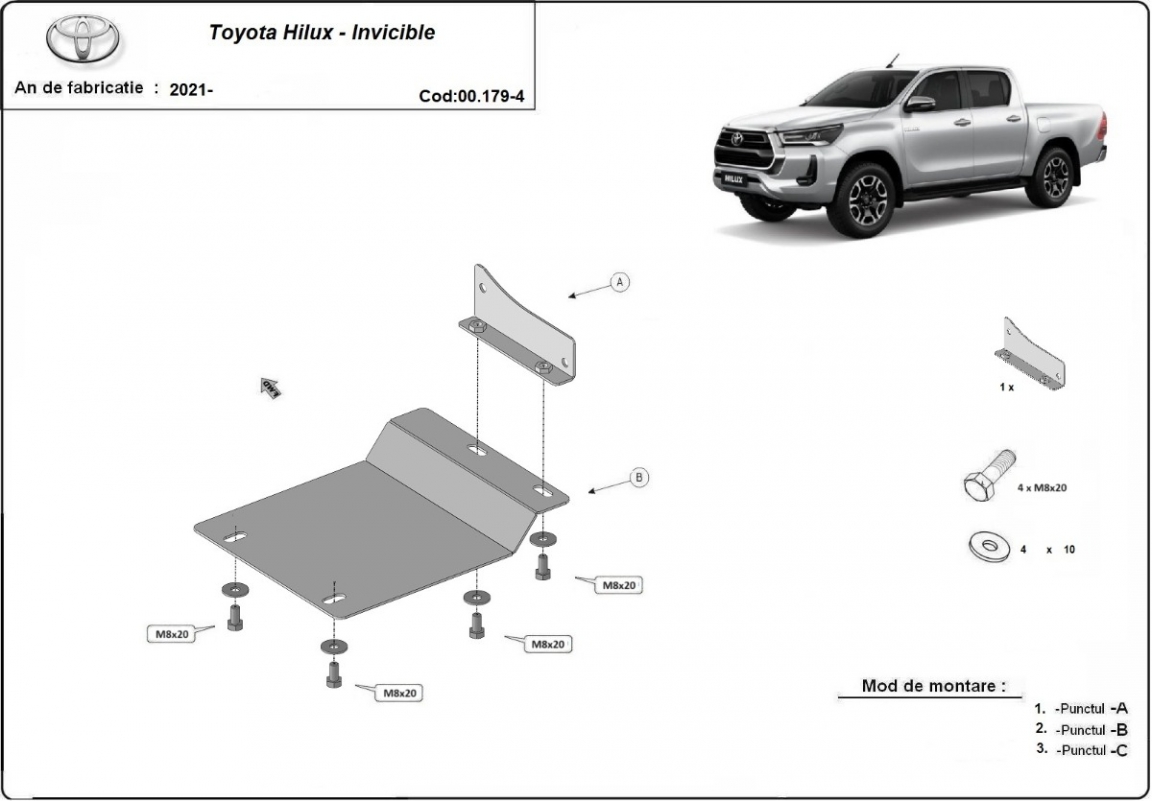 Die Abschirmung schützt: Partikelfiltersensor Toyota Hilux - 2021 und 2026. Der Unterfahrschutz ist neu und passt perfekt für alle Toyota Hilux versionen, die zwischen 2021 und 2026 hergestellt wurden. Aus Stahlblech angefertigt mit einer Stärke von 2 mm. Schrauben, Mutter, Klips - alle Befestigungszubehör sind im Lieferung enthalten. Um mehr Schutz zu bieten gegen Korrosion wird der Unterfahrschutz elektrostatisch besprüht (Pulverbeschichtet) und bei 200o eingebrannt bzw. getrocknet. |