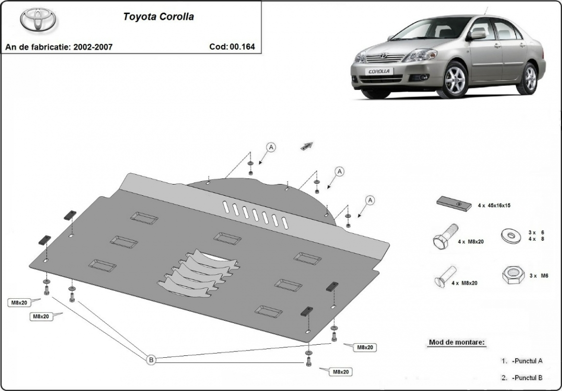 Die Abschirmung schützt: Katalysator Toyota Corolla - 2002 und 2007. Der Unterfahrschutz ist neu und passt perfekt für alle Toyota Corolla versionen, die zwischen 2002 und 2007 hergestellt wurden. Aus Stahlblech angefertigt mit einer Stärke von 2 mm. Schrauben, Mutter, Klips - alle Befestigungszubehör sind im Lieferung enthalten. Um mehr Schutz zu bieten gegen Korrosion wird der Unterfahrschutz elektrostatisch besprüht (Pulverbeschichtet) und bei 200o eingebrannt bzw. getrocknet. |