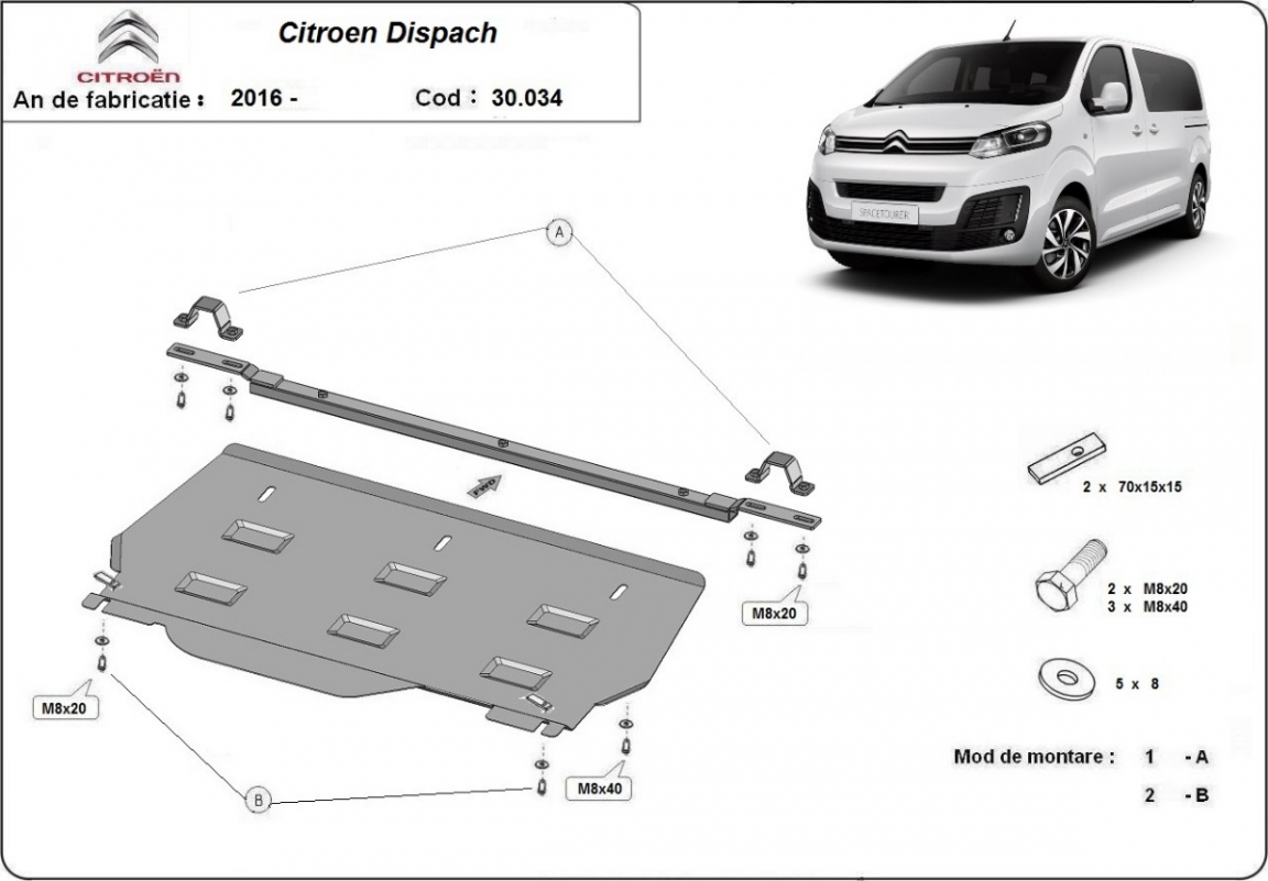 Die Abschirmung schützt: motor, getriebe Citroen Dispatch MPV - 2016 und 2026. Der Unterfahrschutz ist neu und passt perfekt für alle Citroen Dispatch MPV versionen, die zwischen 2016 und 2026 hergestellt wurden. Aus Stahlblech angefertigt mit einer Stärke von 2 mm. Schrauben, Mutter, Klips - alle Befestigungszubehör sind im Lieferung enthalten. Um mehr Schutz zu bieten gegen Korrosion wird der Unterfahrschutz elektrostatisch besprüht (Pulverbeschichtet) und bei 200o eingebrannt bzw. getrocknet. |