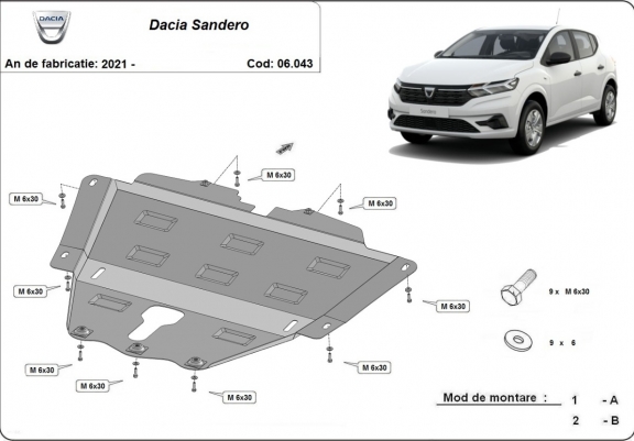 Die Abschirmung schützt: motor, getriebe Dacia Sandero - 2021 und 2026. Der Unterfahrschutz ist neu und passt perfekt für alle Dacia Sandero versionen, die zwischen 2021 und 2026 hergestellt wurden. Aus Stahlblech angefertigt mit einer Stärke von 2 mm. Schrauben, Mutter, Klips - alle Befestigungszubehör sind im Lieferung enthalten. Um mehr Schutz zu bieten gegen Korrosion wird der Unterfahrschutz elektrostatisch besprüht (Pulverbeschichtet) und bei 200o eingebrannt bzw. getrocknet. |