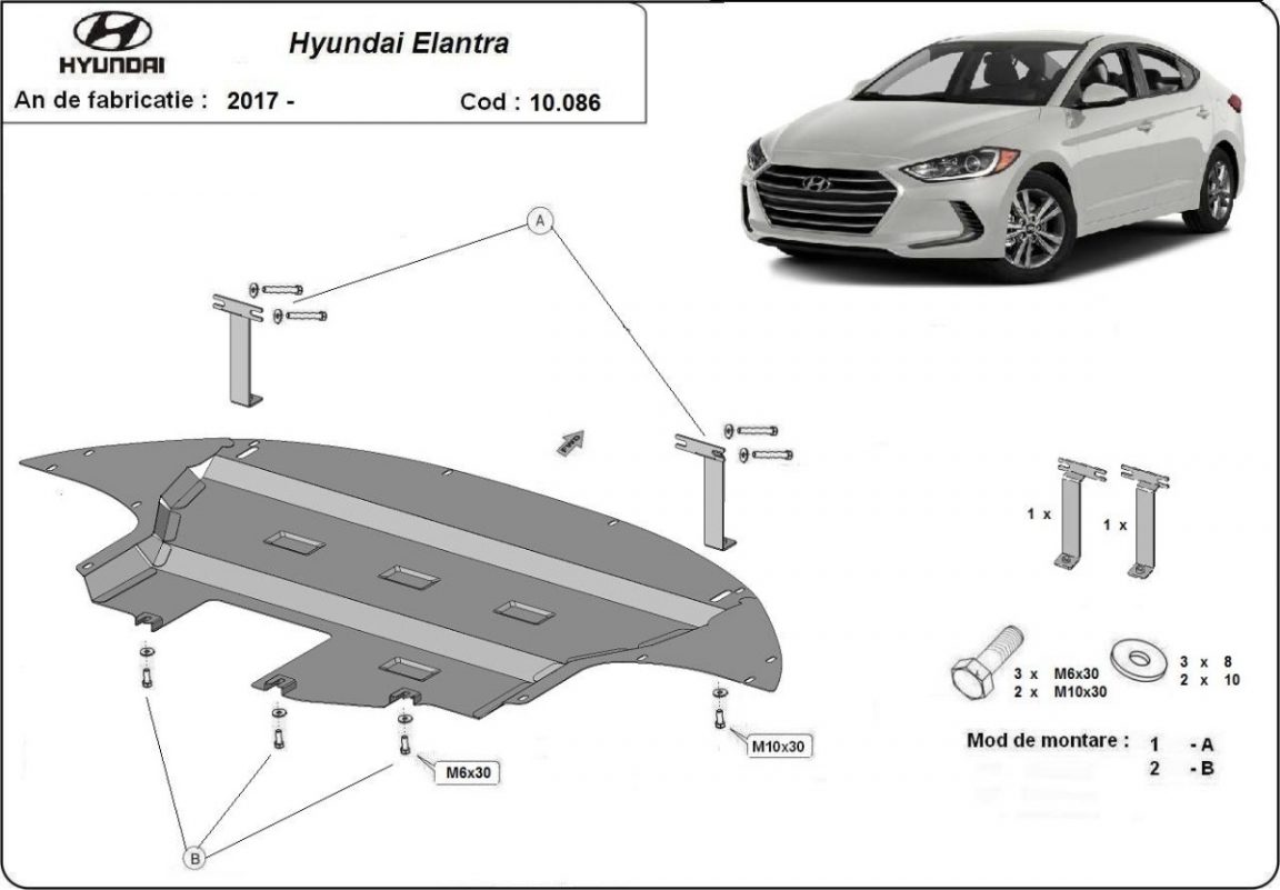 Die Abschirmung schützt: motor, getriebe, kühler, vordere stossfänger Hyundai Elantra - 2016 und 2020. Der Unterfahrschutz ist neu und passt perfekt für alle Hyundai Elantra versionen, die zwischen 2016 und 2020 hergestellt wurden. Aus Stahlblech angefertigt mit einer Stärke von 2 mm. Schrauben, Mutter, Klips - alle Befestigungszubehör sind im Lieferung enthalten. Um mehr Schutz zu bieten gegen Korrosion wird der Unterfahrschutz elektrostatisch besprüht (Pulverbeschichtet) und bei 200o eingebrannt bzw. getrocknet. |