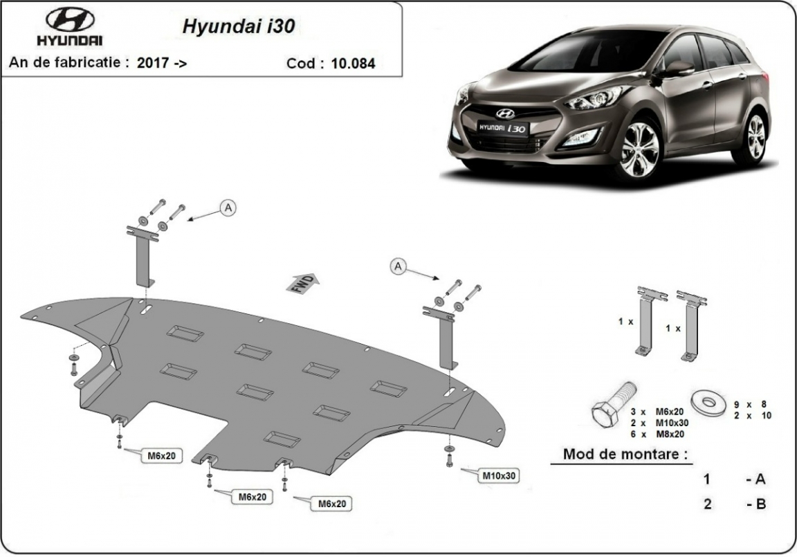 Die Abschirmung schützt: motor, getriebe, kühler, vordere stossfänger Hyundai I30 - 2017 und 2026. Der Unterfahrschutz ist neu und passt perfekt für alle Hyundai I30 versionen, die zwischen 2017 und 2026 hergestellt wurden. Aus Stahlblech angefertigt mit einer Stärke von 2 mm. Schrauben, Mutter, Klips - alle Befestigungszubehör sind im Lieferung enthalten. Um mehr Schutz zu bieten gegen Korrosion wird der Unterfahrschutz elektrostatisch besprüht (Pulverbeschichtet) und bei 200o eingebrannt bzw. getrocknet. |