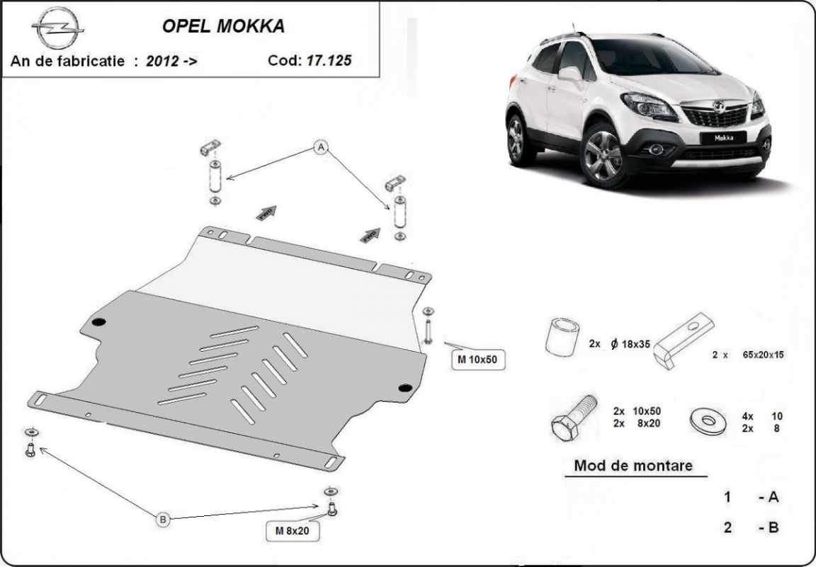 Die Abschirmung schützt: motor, getriebe Opel Mokka - 2012 und 2019. Der Unterfahrschutz ist neu und passt perfekt für alle Opel Mokka versionen, die zwischen 2012 und 2019 hergestellt wurden. Aus Stahlblech angefertigt mit einer Stärke von 2 mm. Schrauben, Mutter, Klips - alle Befestigungszubehör sind im Lieferung enthalten. Um mehr Schutz zu bieten gegen Korrosion wird der Unterfahrschutz elektrostatisch besprüht (Pulverbeschichtet) und bei 200o eingebrannt bzw. getrocknet. |