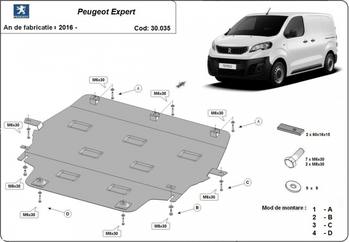 Die Abschirmung schützt: motor, getriebe, kühler Peugeot Expert - 2016 und 2026. Der Unterfahrschutz ist neu und passt perfekt für alle Peugeot Expert versionen, die zwischen 2016 und 2026 hergestellt wurden. Aus Stahlblech angefertigt mit einer Stärke von 2 mm. Schrauben, Mutter, Klips - alle Befestigungszubehör sind im Lieferung enthalten. Um mehr Schutz zu bieten gegen Korrosion wird der Unterfahrschutz elektrostatisch besprüht (Pulverbeschichtet) und bei 200o eingebrannt bzw. getrocknet. |