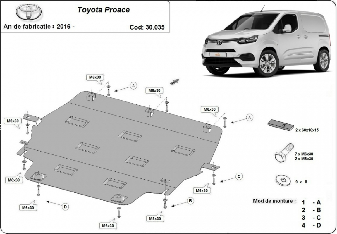 Die Abschirmung schützt: motor, getriebe, kühler Toyota Proace - 2016 und 2026. Der Unterfahrschutz ist neu und passt perfekt für alle Toyota Proace versionen, die zwischen 2016 und 2026 hergestellt wurden. Aus Stahlblech angefertigt mit einer Stärke von 2 mm. Schrauben, Mutter, Klips - alle Befestigungszubehör sind im Lieferung enthalten. Um mehr Schutz zu bieten gegen Korrosion wird der Unterfahrschutz elektrostatisch besprüht (Pulverbeschichtet) und bei 200o eingebrannt bzw. getrocknet. |