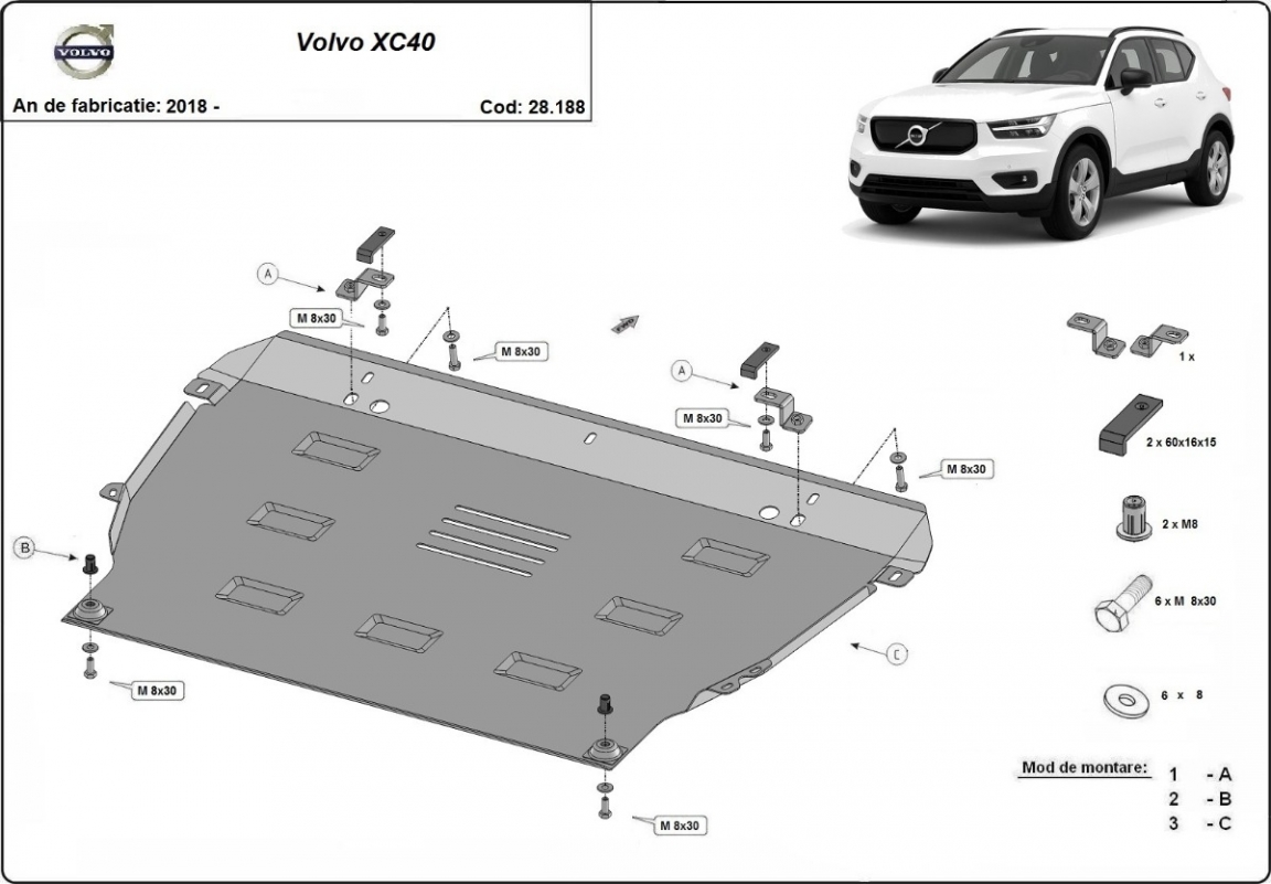 Die Abschirmung schützt: motor, getriebe, kühler Volvo XC40 - 2018 und 2026. Der Unterfahrschutz ist neu und passt perfekt für alle Volvo XC40 versionen, die zwischen 2018 und 2026 hergestellt wurden. Aus Stahlblech angefertigt mit einer Stärke von 2 mm. Schrauben, Mutter, Klips - alle Befestigungszubehör sind im Lieferung enthalten. Um mehr Schutz zu bieten gegen Korrosion wird der Unterfahrschutz elektrostatisch besprüht (Pulverbeschichtet) und bei 200o eingebrannt bzw. getrocknet. |