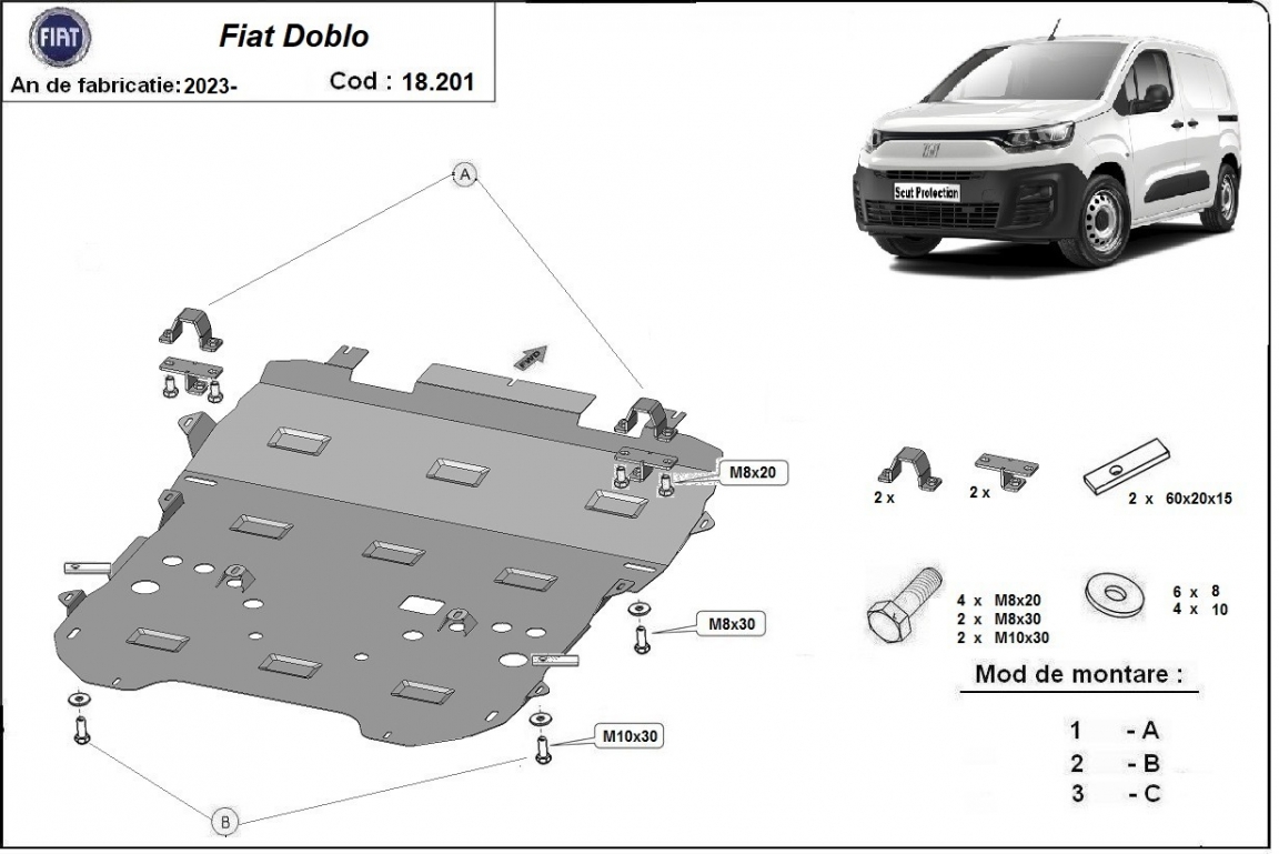 Die Abschirmung schützt: motor, getriebe, kühler, vordere stossfänger Fiat Doblo - 2023 und 2026. Der Unterfahrschutz ist neu und passt perfekt für alle Fiat Doblo versionen, die zwischen 2023 und 2026 hergestellt wurden. Aus Stahlblech angefertigt mit einer Stärke von 2 mm. Schrauben, Mutter, Klips - alle Befestigungszubehör sind im Lieferung enthalten. Um mehr Schutz zu bieten gegen Korrosion wird der Unterfahrschutz elektrostatisch besprüht (Pulverbeschichtet) und bei 200o eingebrannt bzw. getrocknet. |