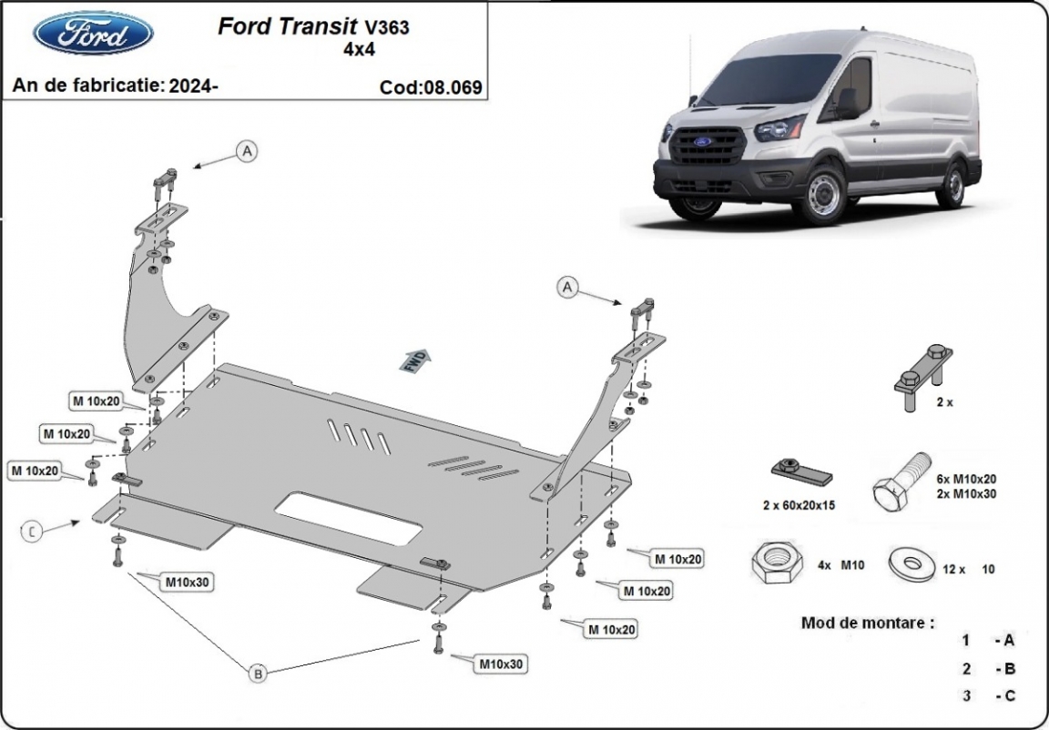 Die Abschirmung schützt: motor, getriebe, kühler Ford Transit V363 - 2024 und 2026. Der Unterfahrschutz ist neu und passt perfekt für alle Ford Transit V363 versionen, die zwischen 2024 und 2026 hergestellt wurden. Aus Stahlblech angefertigt mit einer Stärke von 2.5 mm. Schrauben, Mutter, Klips - alle Befestigungszubehör sind im Lieferung enthalten. Um mehr Schutz zu bieten gegen Korrosion wird der Unterfahrschutz elektrostatisch besprüht (Pulverbeschichtet) und bei 200o eingebrannt bzw. getrocknet. |