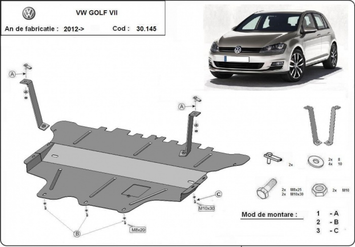 Die Abschirmung schützt: motor, getriebe, kühler, vordere stossfänger VW Golf 7 - 2012 und 2020. Der Unterfahrschutz ist neu und passt perfekt für alle VW Golf 7 versionen, die zwischen 2012 und 2020 hergestellt wurden. Aus Stahlblech angefertigt mit einer Stärke von 2 mm. Schrauben, Mutter, Klips - alle Befestigungszubehör sind im Lieferung enthalten. Um mehr Schutz zu bieten gegen Korrosion wird der Unterfahrschutz elektrostatisch besprüht (Pulverbeschichtet) und bei 200o eingebrannt bzw. getrocknet. |